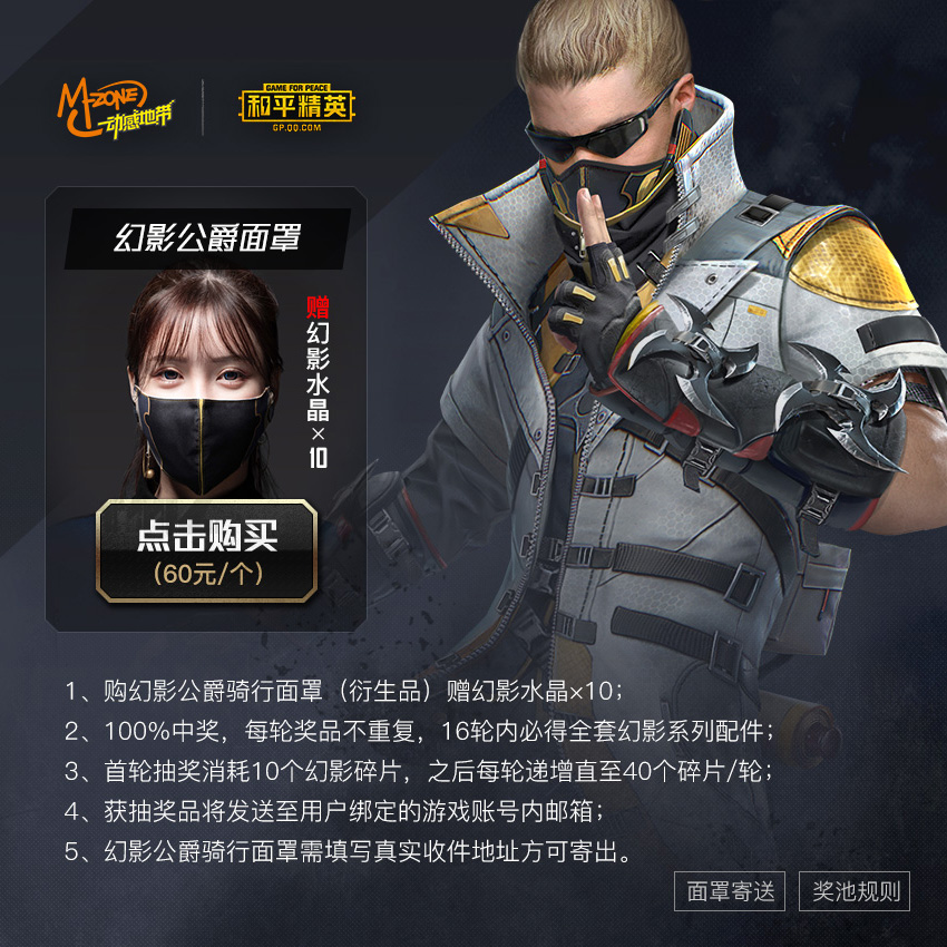 根据动感地带与和平精英联合开发的幻影战神活动需求,我司设计开发了各位幻影战神们的专属面罩,脱离游戏衍生品局限于公仔手办的困境。结合时下疫情防疫需求,使玩家在游戏与生活中都能体现出自身幻影战神的属性。